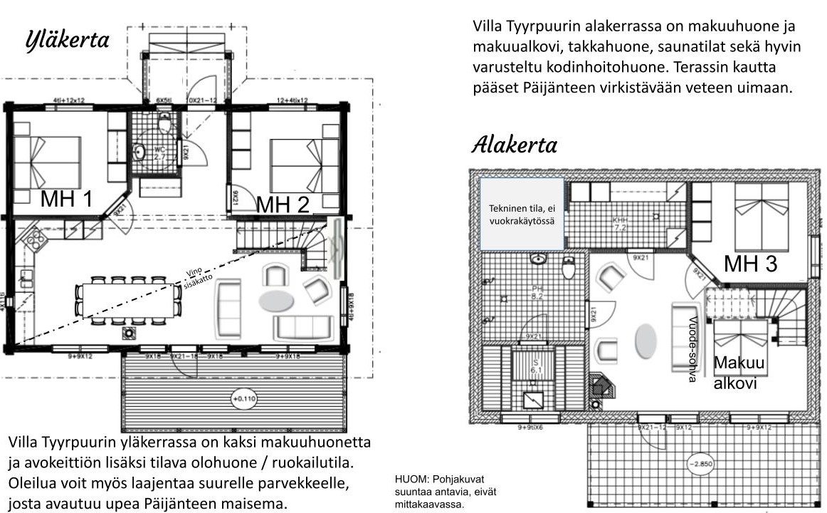 Villa Tyypuurissa on hyvin varusteltu keittiö, tilavat saunatilat, kolme makuuhuonetta + makuualkovi ja suuri parveke, sekä terassi. Laiturilta pääset uimaan suoraan Päijänteeseen.